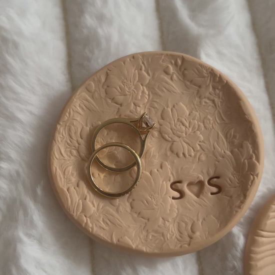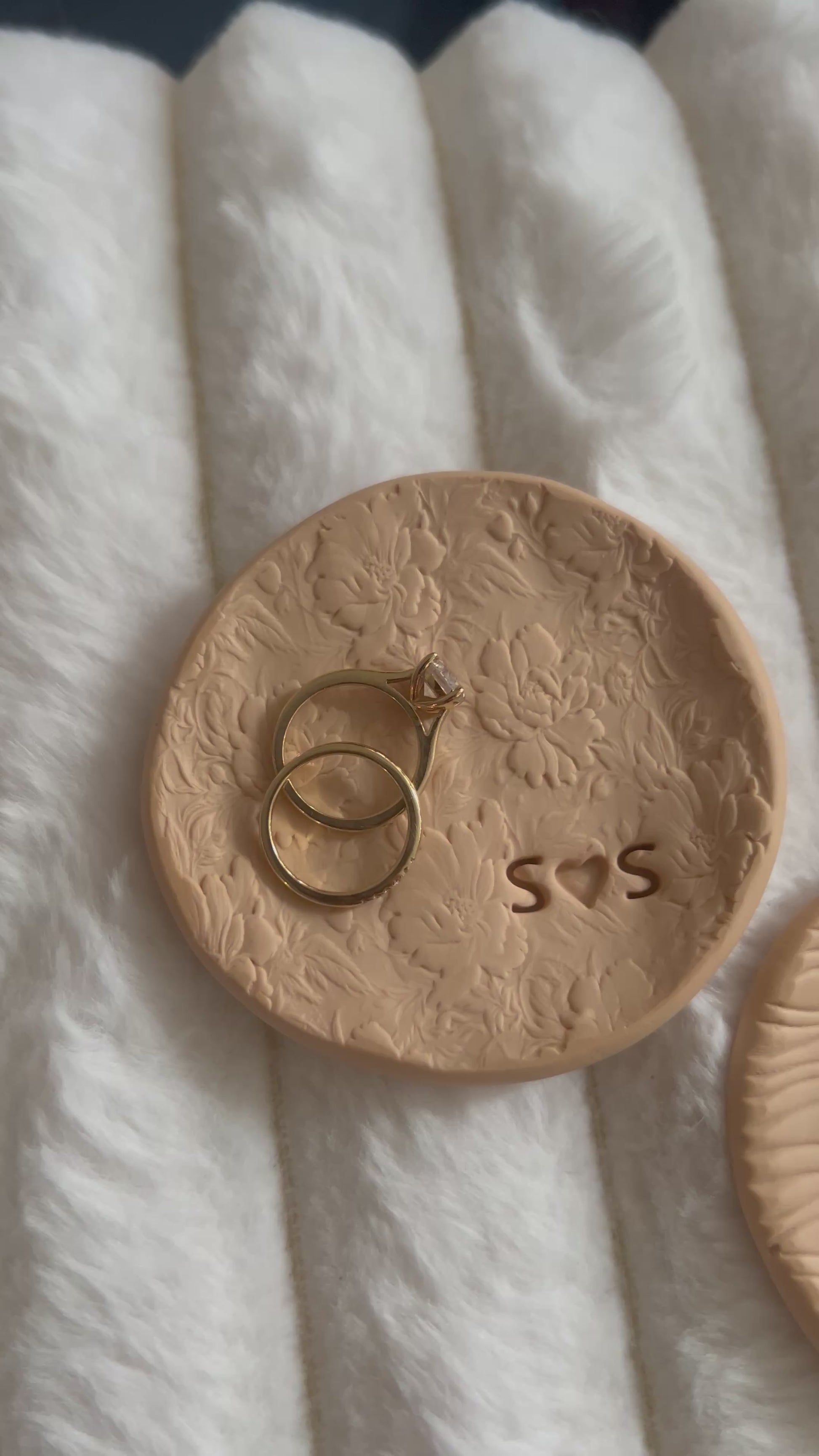 Personalized Rustic Clay Ring Dish – Custom Initials Jewelry Holder in Beige | Floral Engraved or Wavy Texture
